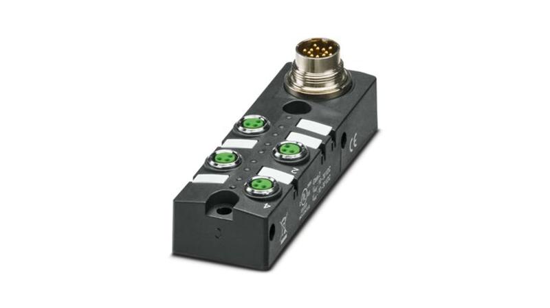 The Phoenix Contact Sensor/actuator box has 4 slots, 3 positions with M8 socket connection system. It has a CuZn contact material, rated voltage of 24 V DC and total rated current of 6 A._x000D_