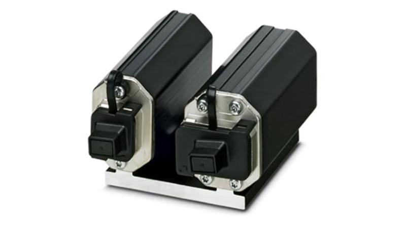 Multi-port power and data connection: push/pull power and RJ45, 10 Gbps, for passive PROFINET cabling to robots, including mounting foot.