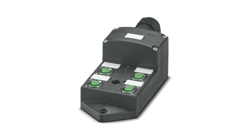The Phoenix Contact Sensor/actuator box has 4 slots, 5 positions with M12-SPEEDCON-socket connection system. It has a Cu alloy contact material, rated voltage of 120 V AC and total rated current of 10 A._x000D_