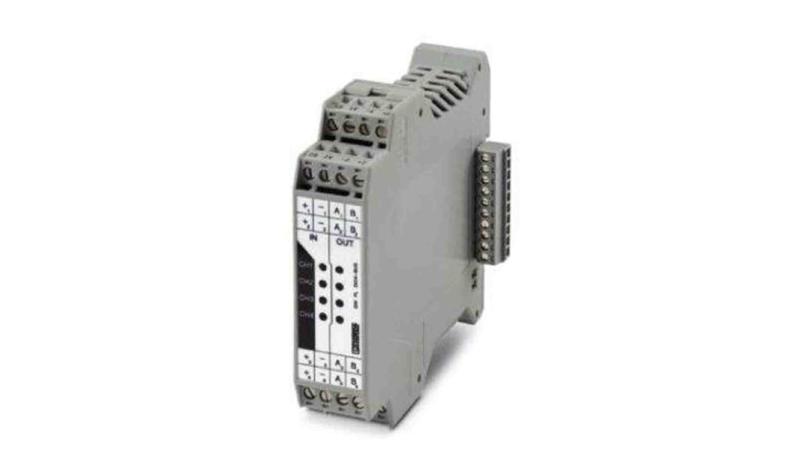 The Phoenix protocol converter has four-channel digital input and four-channel digital output module with screw connection method. Its width is 22.5 and its colour is grey._x000D_