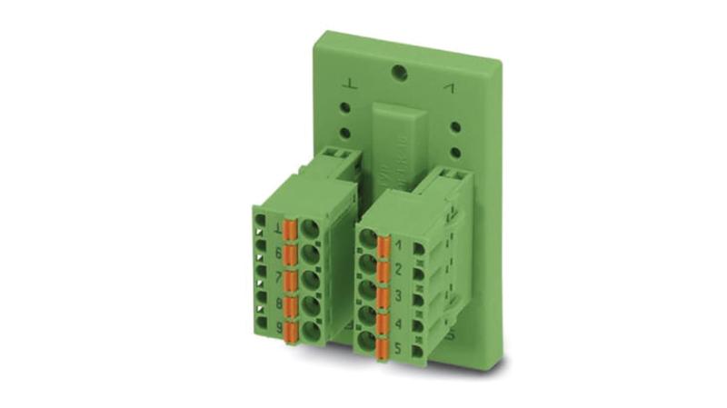 The VARIOFACE feed-through module implements a 1:1 connection between plug-in push-in spring-cage connection terminal blocks and a D-SUB miniature socket strip (number of positions: 9). A separate ground tap is available.