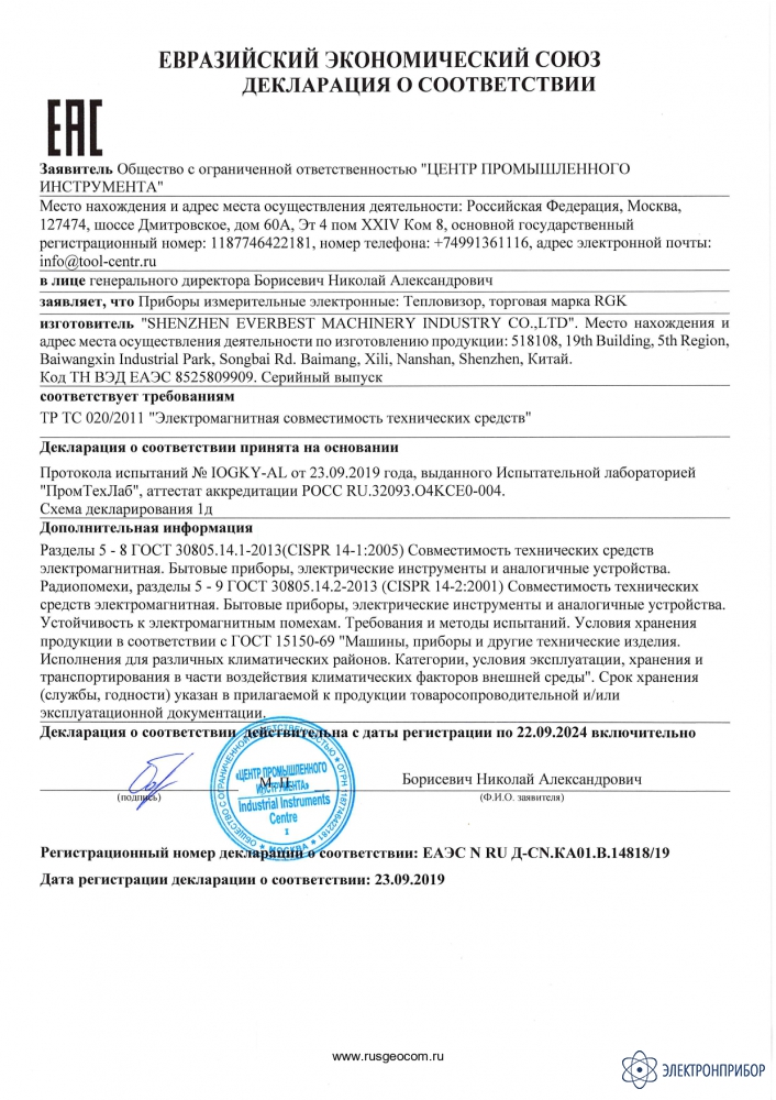 Тепловизор RGK TL-160+ сертифицирован в Госреестре средств измерения. Это не только подтверждает его высокие рабочие характеристики, но и позволяет использовать результаты измерений при составлении официальных документов.