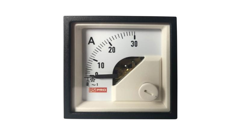 RS PRO AC Analogue Panel Ammeter_x000D_ The RS PRO 45mm x 45mm cut-out AC analogue panel ammeter has a measurement range of 0A to 30A input. The DIN style panel meter comprises a moving iron movement. It indicates true RMS value and is substantially independent of system waveform. The scales are calibrated down to 10% and can have overload scales of X2, X3, X5, or X6 to measure motor inrush current. The meter is housed in a moulded polycarbonate case and is suitable for measurement of AC currents for the frequency range of 15Hz to 400Hz._x000D_ Features and Benefits_x000D_ • Operating temperature ranges between -10°C and 65°C_x000D_ • Accuracy: 1%_x000D_ • Pointer: Knife-edge type_x000D_ • Pointer deflection: 0° to 90°_x000D_ • AC Ammeter nominal range: 100mA to 100A direct connection_x000D_ • Shock resistance: 15g for pulse duration of 11 milliseconds_x000D_ • Moulded square case suitable for mounting control/switchgear panels in machinery consoles_x000D_ • Overload: 2 times nominal current (continuous)_x000D_ • Relative humidity: Less than 75% annual average (noncondensing)_x000D_ Certifications_x000D_ • UL 94 V-0 approved_x000D_ • 2014/30/EC (EMC directive)_x000D_ • 2014/35/EC (low voltage directive)_x000D_ • CE certified_x000D_ • IP52 rated_x000D_ • EN 61010_x000D_ • VDE 0100-410: 2018-10 approved_x000D_ • IEC 529_x000D_ • IEC 61010_x000D_ • ISO 20653: 2006-08