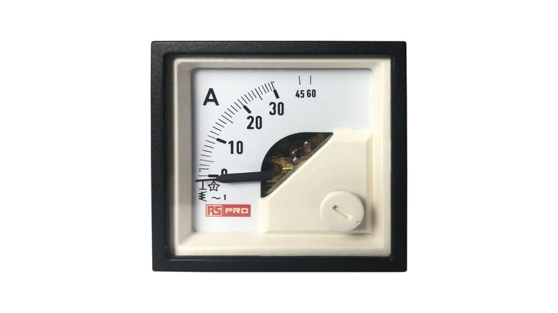 The RS PRO 45mm x 45mm cut-out AC analogue panel ammeter has a measurement range of 0A to 60A input. The DIN style panel meter comprises a moving iron movement. It indicates true RMS value and is substantially independent of system waveform. The scales are calibrated down to 10% and can have overload scales of X2, X3, X5, or X6 to measure motor inrush current. The meter is housed in a moulded polycarbonate case and is suitable for measurement of AC currents for the frequency range of 15Hz to 400Hz._x000D_