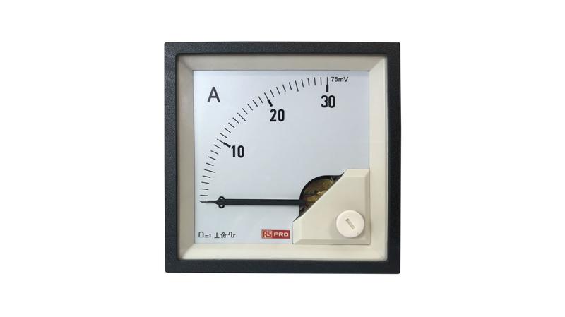 The RS PRO 68mm x 68mm cut-out DC analogue panel voltmeter has a measurement range of 0mV to 75mV input (SHUNT) and 0A to 30A SC. The DIN style panel meter comprises permanent magnet moving coil movements and it indicates an average value. The moving coil movement consists of a magnet, an aluminium coil suspended on pivots, a hairspring, and a jewel mechanism. The scales are linear and calibrated down to zero. High currents are measured with separate shunts attached on the rear side of the meter. The meter is housed in a moulded polycarbonate case._x000D_
