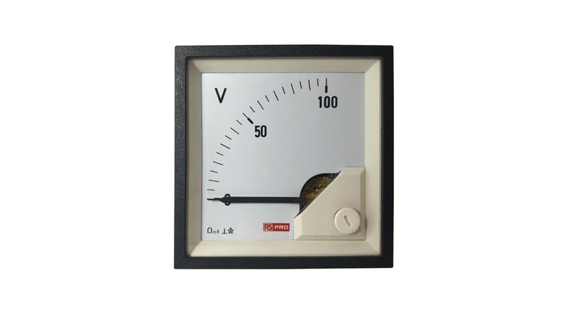 The RS PRO 68mm x 68mm cut-out DC analogue panel voltmeter has a measurement range of 0V to 100V input. The DIN 72 style panel meter comprises permanent magnet moving coil movements and indicates an average value. The moving coil movement consists of a magnet, an aluminium coil suspended on pivots, a hairspring, and a jewel mechanism. The scales are linear and calibrated down to zero. High currents are measured with separate shunts attached on the rear side of the meter. The meter is housed in a moulded polycarbonate case._x000D_