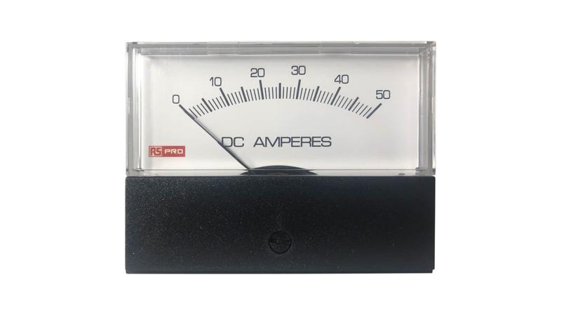 The RS PRO 2.5in 76mm x 74mm cut-out DC analogue panel ammeter has a measurement range from 0A to 50A input. The meter offers a centre cored, self-shielding moving coil movement using pivots, hairsprings, and sprung jewels. The meter is enclosed in a polycarbonate cover. This innovative design features a detachable lower fascia plate that allows good flexibility._x000D_