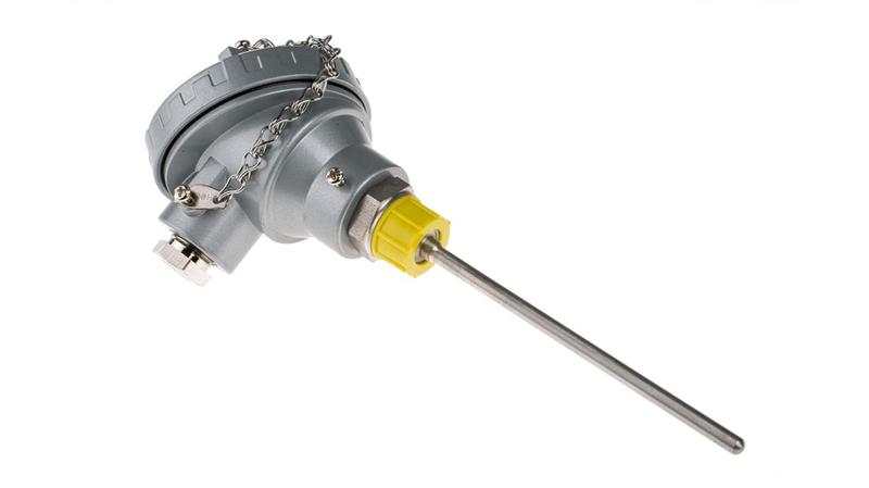 A terminal head is designed to provide access to the connections between the sensor and instrument wiring and providing protection from the elements. The KNE terminal head on this thermocouple has an aluminium finish and is IP67 rated. Built into the head is a compensating terminal block and an M20 cable gland for connection to the external cable. A BSP connection at the base of the head is used for connection to the thermocouple probe. The terminating head also features a screw cap and retaining chain_x000D_