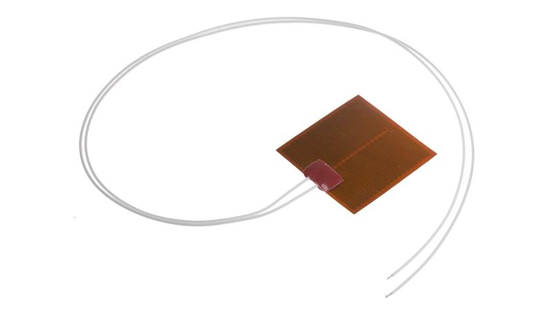 The heater mat measures 50 mm in length and 50 mm in width and is 0.2 mm thick. It's made from Kapton©, a thin and lightweight heating material that offers good resistance to fungi and bacteria, meaning it's suitable for use in sterilisation tasks. It's also weather-resistant and ozone-resistant, and you can use it at temperatures as low as -60°C and as high as +200°C. It performs at its best in combination with temperature-sensing and control elements._x000D_