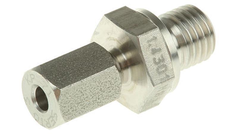 Stainless steel compression fittings for mineral insulated thermocouples_x000D_ Stainless steel compression fitting with various drill-hole diameters_x000D_ PTFE compression ring for temp. up to 200 °C_x000D_ Max. operating pressure 10 bar_x000D_ Adjustable and releasable_x000D_ Stainless steel compression ring for temp. up to 500 °C_x000D_ Max. operating pressure 40 bar_x000D_ Tapered ring can no longer be released after tightening
