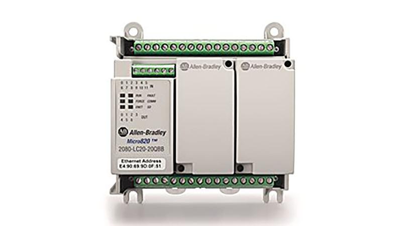 Our Micro820® Programmable Logic Controller Systems include a nano-sized footprint and are designed for small standalone machine control and remote automation applications that require flexible communications and I/O capabilities. These controllers support up to 36 I/O points with many embedded features such as Ethernet, microSD slot for recipe and data log, and analogue I/O._x000D_ Offers 20-point controllers_x000D_ Provides embedded 0...10V non-isolated 4 channel analog input and 1 channel analog output for speed control of an AC drive_x000D_ Provides embedded communications via non-isolated serial port (for RS-232 and RS-485 communications) and Ethernet port_x000D_ Communicates via EtherNet/IP™_x000D_ Provides embedded support for up to four 10k thermistor temperature inputs_x000D_ Supports program download through USB with an optional 3.5-in. Remote LCD_x000D_ Supports up to two Micro800™ Plug-in Modules_x000D_ Supports microSD™ card for program transfer, datalog, and recipe management_x000D_ Applications_x000D_ Air handling unit_x000D_ Pump control with SMS plug-in