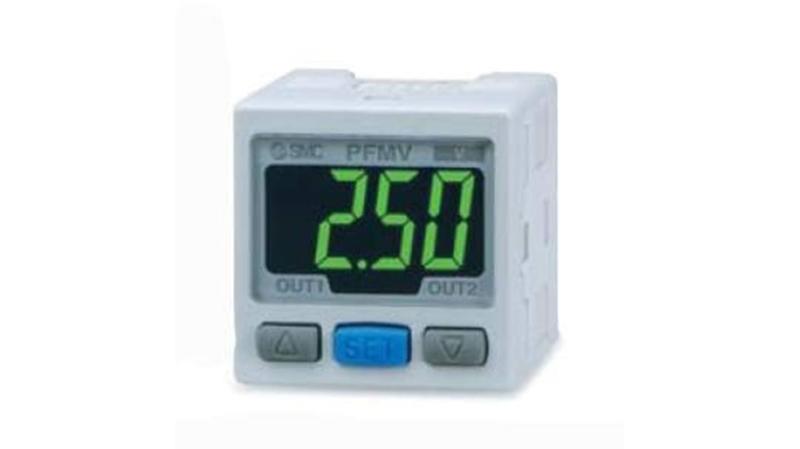 The SMC PFMV5 series is a low flow analog sensor compatible with air and nitrogen. It is intended to provide more reliable detection of suction of small components than can be achieved with a pressure sensor. Its small size permits deployment into areas with tight clearance, or manifold arrangements with a small footprint. The sensor includes a fixed cable and holes for direct mounting, with an optional mounting bracket kit. It is IP40 rated._x000D_