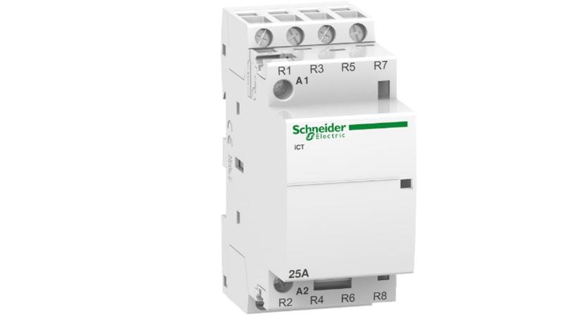 The Schneider Electric Acti9 iCT is a modular contactor. It is a 4P remote control device with 4 normally close contact. The rated current is 25A for AC-7a and 8.5A for AC-7b. The Ue rated operational voltage is 400VAC. The Uc control voltage is 24VAC._x000D_
