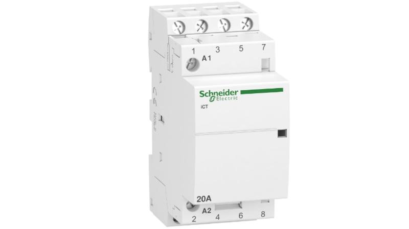The Schneider Electric Acti9 iCT is a modular contactor. It is a 4P remote control device with 4 normally open contacts. The rated current is 20A for AC-7a. The Ue rated operational voltage is 400VAC. The Uc control voltage is 220VAC to 240VAC. This device could be used for control circuits._x000D_