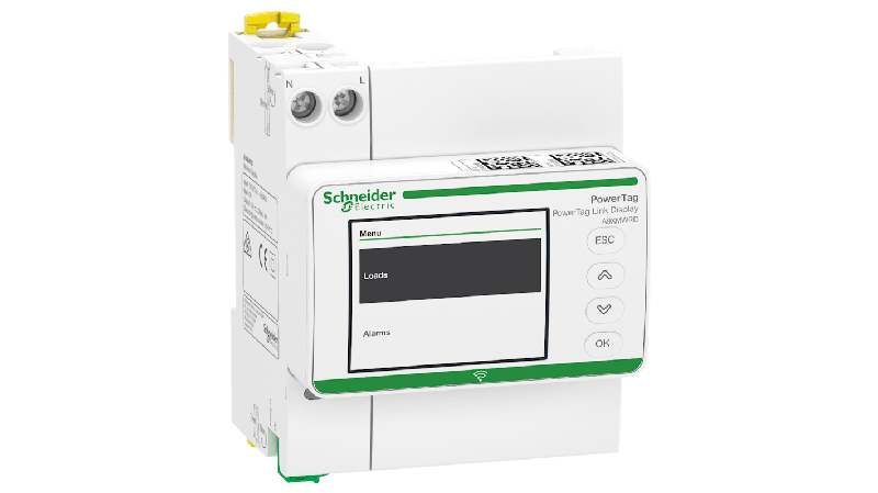 The Schneider Electric Acti9 PowerTag link display is the wireless local HMI of the PowerTag system. It will display on the front door of your electrical panel the values collected by wireless energy sensors such as measured current, voltage, power factor, power and energy. The display can be installed on a DIN rail, clipped-on by its power supply, or as said flush mounted on the front door. Also the link display gives alarms locally._x000D_