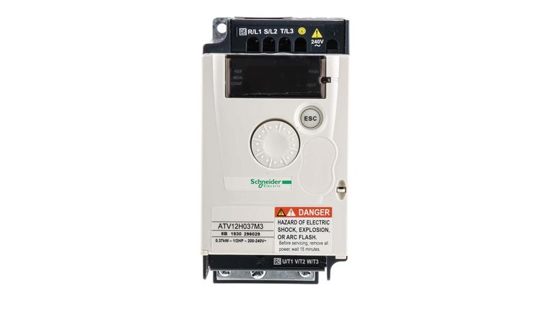 The ATV12H037M3 VFD by Schneider Electrics is a single phase variable speed asynchronous motor drive. It has a power rating of 0.37 kW and a supply voltage of 230 V. This variable frequency inverter dimensions are - length 143mm, 72mm width and an overall depth of 121mm.