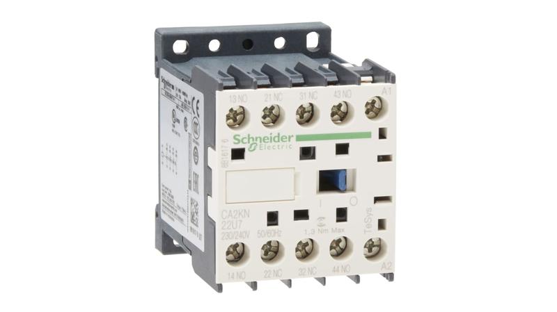 Schneider Electric | TeSys K Series | Control Relays_x000D_ Creating seamless integration in all automation applications, compactness ratio and high performance, the TeSys K series is a range of reversing or non-reversing contactors. All 4 pole relays have 10A thermally rated contacts which are suitable for AC or DC control voltages. In addition the series also features low consumption coil versions with built in suppression which are suitable to be used with programmable controllers._x000D_ Features and Benefits:_x000D_ • Common options available for all 6, 9, 12 A ratings_x000D_ • AC and DC Control circuits available_x000D_ • Low-consumption DC and silent_x000D_ • Variety of auxiliary contacts, and timer modules_x000D_ • Clamp terminals as standard with spring terminal, printed circuit board connection and fast-on connector types available_x000D_ • Consistent connection tightness_x000D_ • Power consumption for Vac types 4.5 VA_x000D_ • Power consumption for Vdc types 2.4 W_x000D_ • Resistance to vibration & temperature cycling_x000D_ • Din or screw fixing_x000D_ Protection ratings & Safety features:_x000D_ • BS 5424, IEC 60947, NF C 63-140 and VDE 0660 standards_x000D_ • CSA and UL certification_x000D_ • IP2x protection_x000D_ • TC conforming to IEC 60068_x000D_ Applications - Ideal for Zones sensitive to noise, disturbed mains supplies, industry, building and infrastructure. Other applications include:_x000D_ • Switching contactor or relay coils_x000D_ • Powering control and signalling equipment_x000D_ • Simple control systems_x000D_ Note_x000D_ Relays are positively guided.