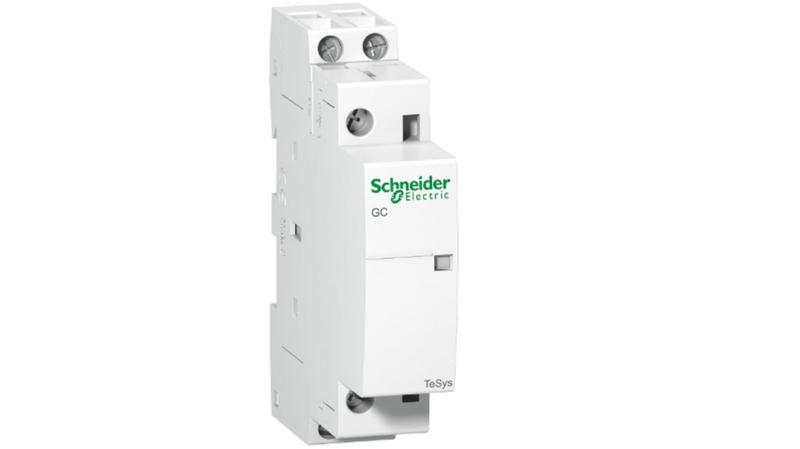 The Schneider Electric TeSys GC modular contactor, 2 poles (1NO+1NC), 25A/250V AC-7a (heating) and 8.5A/250V AC-7b (motor control), for household applications. Control voltage 220-240V AC 50Hz, state indicator on front._x000D_