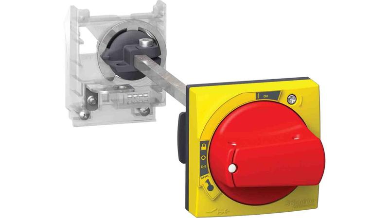 The Schneider Electric TeSys GV extended rotary handle, for motor circuit breakers GV2L, GV2P mounted inside an enclosure and to be operated externally. For emergency switch usage, it provides a red handle on yellow front plate with indication of 2 positions OFF, ON. To be mounted on the door of the enclosure, the handle mechanism ensures an IP65 protection to the mounting. It also includes a mounting adaptor to be screwed on the face of the circuit breaker, and an extension shaft to be adjusted in length (distance between the door and the back of the circuit breaker must be in range 146-256mm). Padlockable in OFF position with up to 3 padlocks (to be ordered separately)._x000D_