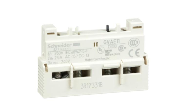 The Schneider Electric TeSys GV auxiliary contact block, for motor circuit breakers GV2 and GV3. 1NO+1NC instantaneous auxiliary contacts. To be installed on left-hand side of the circuit breaker (2 blocks mounting possible), connection by spring terminals._x000D_