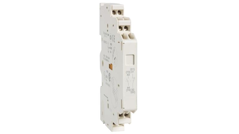 The Schneider Electric TeSys Deca auxiliary contact block has 2 changeover contacts and left side mounting._x000D_