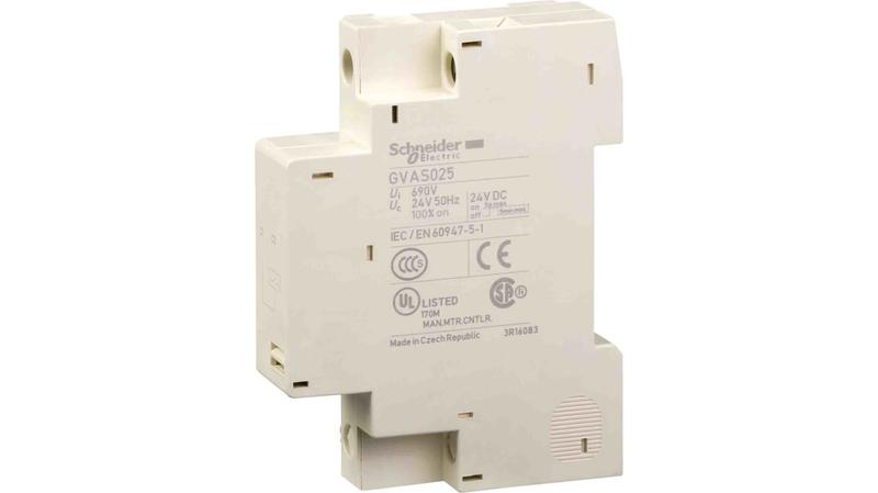 The Schneider Electric GVAS025 is a TeSys GV electrical trip unit, MX shunt trip, 24V AC 50Hz, for motor circuit breakers GV2, GV3. It trips the circuit breaker when the control voltage is applied in limits 0.7-1.1 Uc with an impulse duration greater than 20ms or a maintained signal. To be mounted on the right-hand side of the circuit breaker, connection by spring terminals. Multi standards certified (IEC, UL, CSA, CCC, EAC), Green Premium compliant (RoHS/REACh)._x000D_