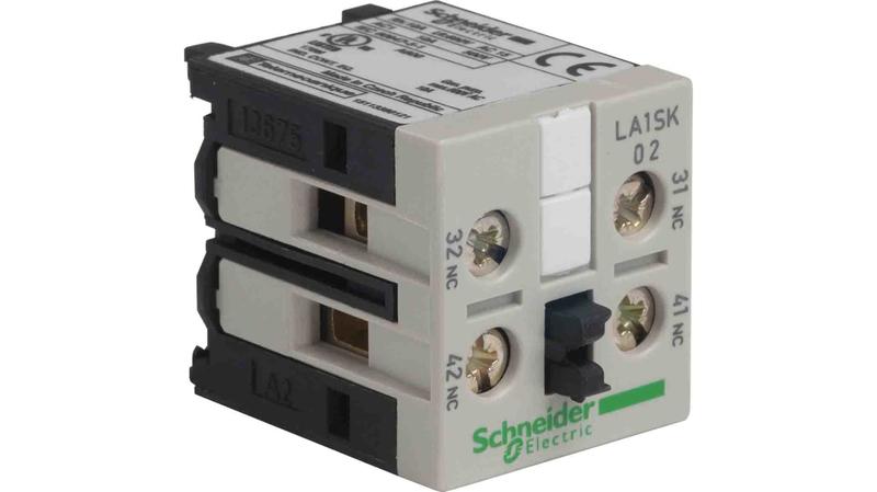 The Schneider Electric TeSys SK instantaneous auxiliary contact block, for mini contactors LC1SK, LP1SK and mini control relays CA2SK, CA3SK. Front mounting by clip-on, it procures high reliability and durability. Multi standards certified (IEC, UL, CSA)._x000D_