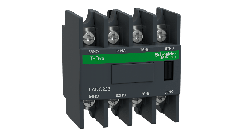 The Schneider Electric instantaneous auxiliary contact block for contactors with side mounting and has lugs-ring terminals._x000D_