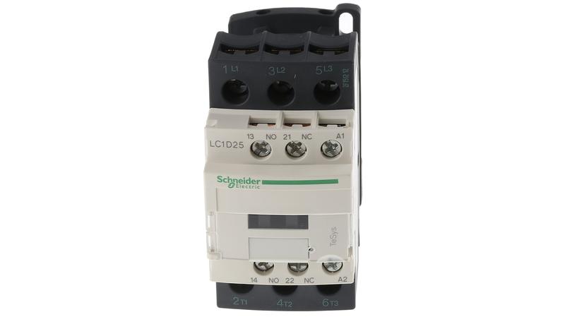 The Schneider Electric LC1D25FE7 model is a 3 pole contactor featuring a 115 V ac operating coil, with an AC-3 full load current rating of 25 A.