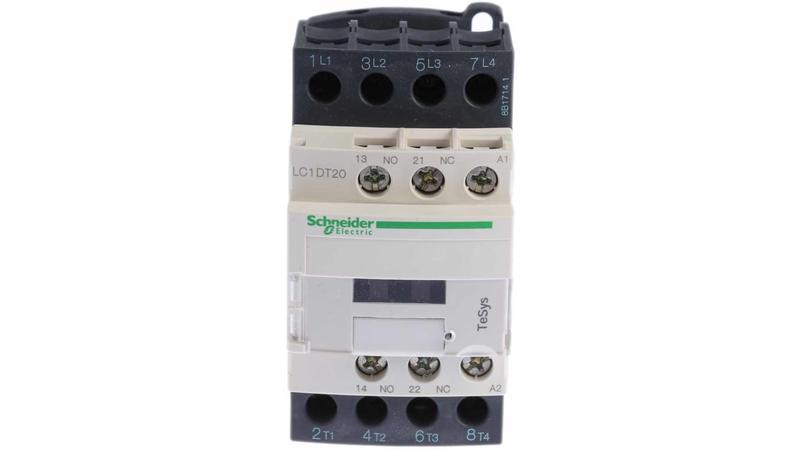 The Schneider Electric LC1DT20B7 model is a 4 pole contactor featuring a 24 V ac operating coil, with an AC-3 full load current rating of 20 A.