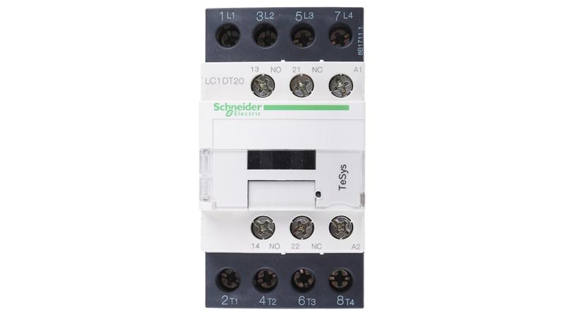 The Schneider Electric LC1DT20F7 model is a 4 pole contactor featuring a 110 V ac operating coil, with an AC-3 full load current rating of 20 A.