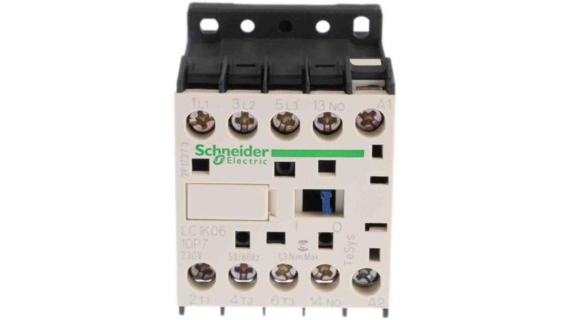 The LC1K0610P7 is a miniature 3 pole contactor featuring a 230 V ac operating coil, an AC-3 full load current of 6 A and a normally open auxiliary contact._x000D_