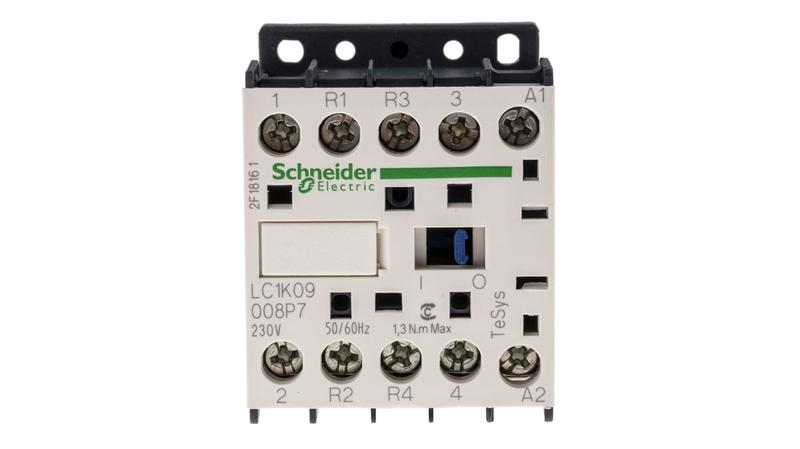 The LC1K09008P7 is a miniature 4 pole contactor featuring a 230 V ac operating coil, an AC-3 full load current of 20 A and a normally open auxiliary contact.