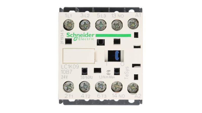 The LC1K0910B7 is a miniature 3 pole contactor featuring a 24 V ac operating coil, an AC-3 full load current of 9 A and a normally open auxiliary contact.