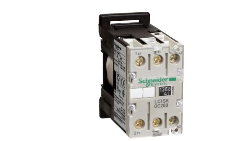 The Schneider Electric TeSys SKGC mini-contactor, 2 poles (2NO), for non-inductive load applications up to 20A/690V AC-1, and for 1-phase motor control applications up to 5A/690V AC-3. It provides a 230V 50/60Hz AC control circuit, a transparent protective cover to prevent front face access, connection by screw terminals._x000D_