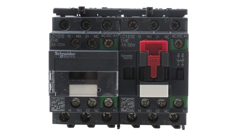 Schneider Electric LC2D TeSys D Reversing Contactors._x000D_ TeSys D reversing Contactors from Schneider Electric combine long mechanical and electrical life to offer a high reliable contactor. The LC2D series is preassembled with reversing power busbar and has been designed for motor control or resistive load applications. The TeSys D contactors offer quick simple setup while maintaining compliance with international standards._x000D_ Features and Benefits._x000D_ Built-in auxiliary contacts for added switching capability_x000D_ Pre-installed interlock_x000D_ Screw connections: IP20 finger-safe terminals with both North American and International terminal markings_x000D_ Can be panel mounted with screws or DIN Rail mounted_x000D_ Easily installed accessories_x000D_ Flexible control circuit to suit a wide range of applications_x000D_ What does the utilisation category AC1 and AC3 mean for the TeSys contactors?_x000D_ Contactor utilisation categories define the current making and breaking values, based on the type of load to be controlled and the operating cycle conditions._x000D_ AC-1: This applies to all AC devices with a power factor of at least 0.95. Example of use: resistive load, heating, distribution._x000D_ AC-3: This applies to squirrel cage motors where breaking occurs while the motor is running._x000D_ Example of use: all squirrel cage motors, lifts, escalators, conveyors, bucket elevators, compressors, pumps, mixers, air conditioning units._x000D_ What is a reversing contactor?_x000D_ A reversing contactor is an assembly of two of standard contactors, with a mechanical and electrical interlock connecting them. The interlocks allow only one contactor to be closed (giving power supply to the motor) at any time._x000D_ Is the TeSys D range a double break pole type contactor?_x000D_ Yes, the Tesys D range uses linear translation movement that provides double breaking of the poles.