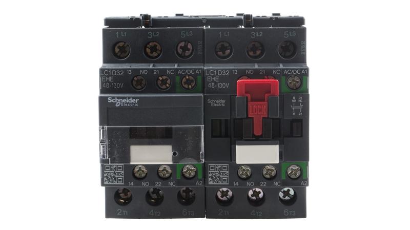 Schneider Electric LC2D TeSys D Reversing Contactors._x000D_ TeSys D reversing Contactors from Schneider Electric combine long mechanical and electrical life to offer a high reliable contactor. The LC2D series is preassembled with reversing power busbar and has been designed for motor control or resistive load applications. The TeSys D contactors offer quick simple setup while maintaining compliance with international standards._x000D_ Features and Benefits._x000D_ Built-in auxiliary contacts for added switching capability_x000D_ Pre-installed interlock_x000D_ Screw connections: IP20 finger-safe terminals with both North American and International terminal markings_x000D_ Can be panel mounted with screws or DIN Rail mounted_x000D_ Easily installed accessories_x000D_ Flexible control circuit to suit a wide range of applications_x000D_ What does the utilisation category AC1 and AC3 mean for the TeSys contactors?_x000D_ Contactor utilisation categories define the current making and breaking values, based on the type of load to be controlled and the operating cycle conditions._x000D_ AC-1: This applies to all AC devices with a power factor of at least 0.95. Example of use: resistive load, heating, distribution._x000D_ AC-3: This applies to squirrel cage motors where breaking occurs while the motor is running._x000D_ Example of use: all squirrel cage motors, lifts, escalators, conveyors, bucket elevators, compressors, pumps, mixers, air conditioning units._x000D_ What is a reversing contactor?_x000D_ A reversing contactor is an assembly of two of standard contactors, with a mechanical and electrical interlock connecting them. The interlocks allow only one contactor to be closed (giving power supply to the motor) at any time._x000D_ Is the TeSys D range a double break pole type contactor?_x000D_ Yes, the Tesys D range uses linear translation movement that provides double breaking of the poles.