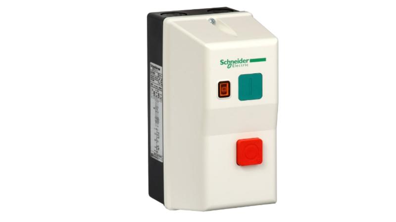 The Schneider Electric TeSys enclosed starter with contactor and thermal overload relay, 3 poles, for non-reversing motor control applications up to 5.5kW@400V AC-3. Surface mounting enclosure with screw fixing, 2 knock-outs for cable glands on top and bottom._x000D_