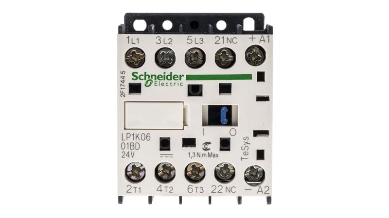 The LP1K0601BD is a miniature 3 pole contactor featuring a 24 V dc operating coil, an AC-3 full load current of 6 A and a normally closed auxiliary contact._x000D_