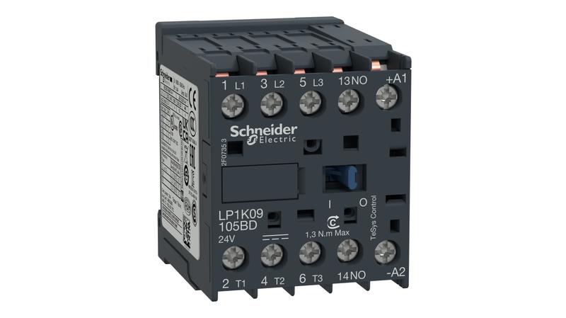 The Schneider Electric TeSys K contactor, 3 poles (3NO), for motor control applications up to 9A/690V AC-3 (4kW@400V), and for non-inductive load control applications up to 20A/690V AC-1. It provides a 24V DC coil, 1NO built-in auxiliary contact, connection by solder pins for printed circuit boards._x000D_