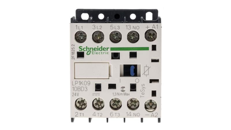 The LP1K0910BD3 is a miniature 3 pole contactor featuring a 24 V dc operating coil, an AC-3 full load current of 9 A and a normally open auxiliary contact.
