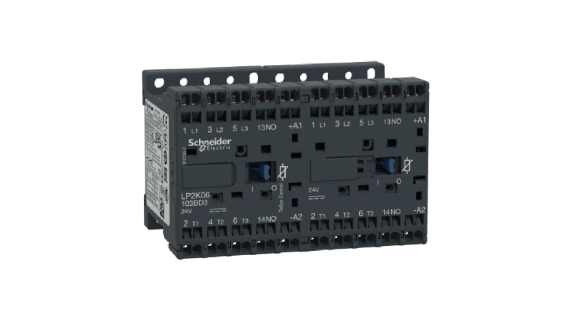 The Schneider Electric reversing contactor for motor control applications. For operating rates until 600 cycles per hour in AC-3 and environments until 50°C, it procures reliability and durability to standard applications. It is compact and has DIN-rail mounting or screw fixing. With mechanical interlock this model has no pre-wired reversing power connections._x000D_