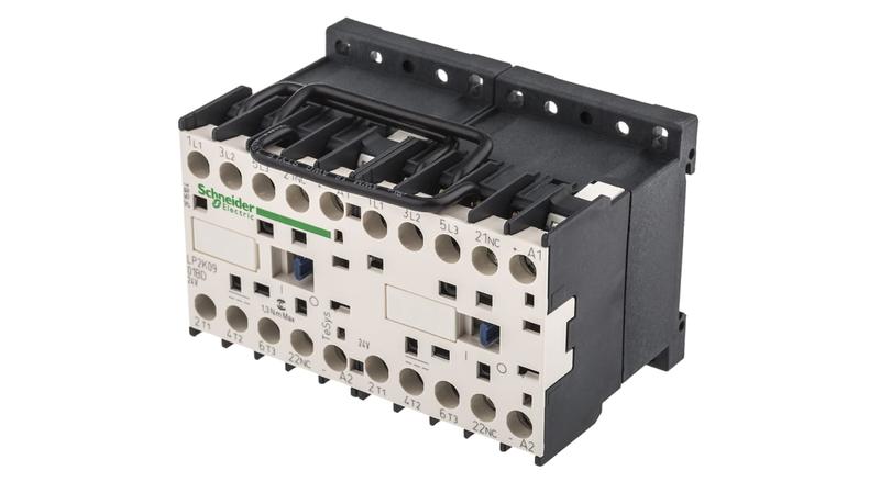 A reversing contactor joins two contactors together mechanically and electrically, enabling it to change a current's polarity and direction. This 3-pole reversing contactor is part of Schneider Electric's TeSys K range and is an ideal choice for motors that need forward/reverse and left/right commands. It's been rated for utilisation categories AC-1, AC-3 and AC-4, so you can use it for both non-inductive and slightly inductive loads such as those found in resistive furnaces and heaters. It can also be used with all types of self-starting squirrel-cage induction motors._x000D_
