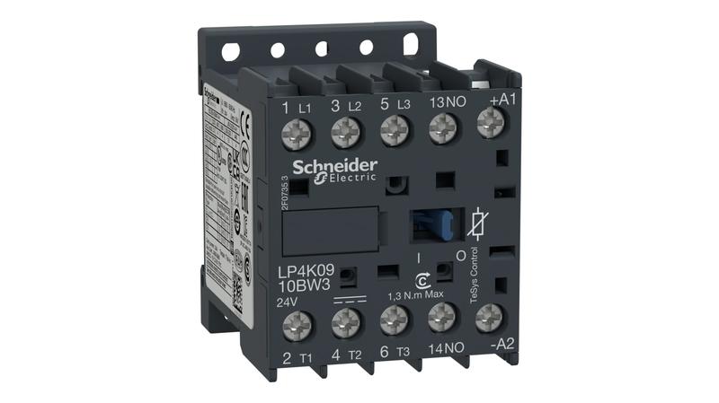 The LP4K0910BW3 is a miniature 3 pole low consumption contactor featuring a 24 V dc operating coil, an AC-3 full load current of 9 A and a normally open auxiliary contact.