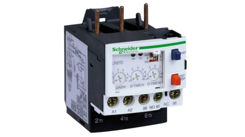 The Schneider Electric TeSys LR97D electronic overcurrent relay, 25A/690V, to be supplied with 200-240V AC, for protection of motors with a rated current 5-21A. It provides 3 dials to adjust the protection, LOAD (5-25A) for the overcurrent level, O-TIME (0.3-10sec) for the acceptable duration of the overcurrent, D-TIME (0.5-30sec) for the starting duration._x000D_