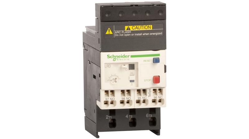 The Schneider Electric TeSys LRD thermal overload relay provides a thermal adjustment dial, a manual-automatic reset selector, a test selector for simulation of a tripping, reset and stop buttons, a flag indicator and 2 auxiliary contacts 1NO+1NC for fault signalling. Settings are protected by a transparent cover lockable by sealing. Connection by screw clamp terminals, it connects directly to the bottom terminals of 3-pole contactors._x000D_