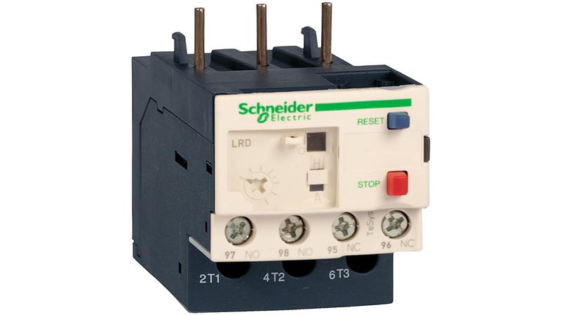 The Schneider Electric TeSys LRD thermal overload relay provides a thermal adjustment dial, a manual-automatic reset selector, a test selector for simulation of a tripping, reset and stop buttons, a flag indicator and 2 auxiliary contacts 1NO+1NC for fault signalling. Settings are protected by a transparent cover lockable by sealing. Connection by screw clamp terminals, it connects directly to the bottom terminals of 3-pole contactors._x000D_