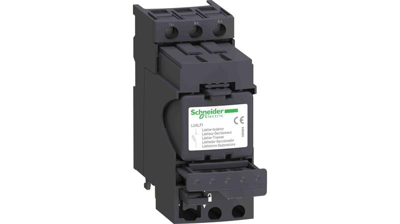 The Schneider Electric TeSys U short circuit current limiter block to be connected in series and upstream of a TeSys U starter controller. It includes a limiter cartridge LUALF1. To be mounted directly on the upstream terminals of a power base, it must be connected to one power base only._x000D_
