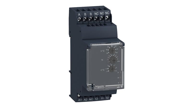 The Schneider Electric temperature control relay has 1 C/O output contacts and 24 to 240 V AC/DC rated supply voltage, 5 A output current with 8 second reset time, 0.6 W DC power consumption._x000D_