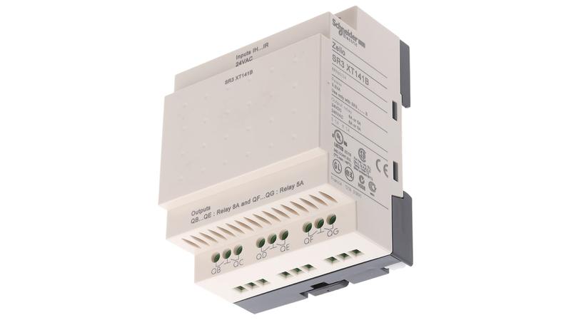 Schneider Electric | Zelio Logic SR3 Series | Logic Module_x000D_ The Zelio Logic SR3 series by Schneider Electric provides an alternative to solutions based on cable logic or specific cards. This range is compact, with Modbus or Ethernet communication extension modules compatible with the device. Signal the device remotely, or on-site, you can control the module on your terms. For use with Zelio Logic Modules._x000D_ Features and benefits:_x000D_ • A real-time clock built in with a 10 year back up time @ 25°C._x000D_ • 6 Outputs & 8 Inputs (No display)._x000D_ • Low power consumption with a generous supply voltage of 24 V dc. The base unit should be chosen such that the supply voltage matches the base unit it will be used with._x000D_ • DIN Rail or panel mounting with screw terminals depending on your need._x000D_ • Cost-effective in reducing space needed with the compact models vs. other basic modules._x000D_ • Intuitive programming with Zelio Soft 2 software using function block diagram (FBD): this has 32 pre-programmed functions, 7 Grafcet functions, 6 logic functions_x000D_ OR_x000D_ contact language (LADDER): 12 pre-programmed functions._x000D_ • IP20 & IP40 protected (protection of water sprays and solid objects up to 1 mm e.g. tools, wires)._x000D_ Applications - where can I use it?_x000D_ Logic modules are useful for when you need to perform a process without human intervention, therefore the list is not limited. Logic Modules may even be connected to other Logic Modules for example. Below you'll find some typical applications:_x000D_ • Control systems for smaller machinery/replacement of controls_x000D_ • Lighting management_x000D_ • Heating and air conditioning controls_x000D_ Schneider Electric Zelio Logic 2 Smart Relay - Additional Info:_x000D_ Schneider Electric now offers a new generation of expandable intelligent relays, offering substantial advantages in flexibility and functionality. Zelio Logic 2 Smart Relay is the optimum solution to control tasks such as automating small machines within industry, lighting, HVAC and access control within buildings._x000D_ With the small footprint, simple programming, powerful control functions and the possibility of changing or modifying the program in case of changed application requirements, it offers great savings in space and price compared to other options._x000D_ Choose between two new series - Compact and Modular. The Compact series is not expandable and is available with the following I/O block sizes: 10 I/O, 12 I/O and 20 I/O._x000D_ The Modular series is available with 10 and 26 I/O basic units and is expandable up to 40 I/O with the latter. Apart from this flexibility both new series are programmable using FBD, ladder and Grafcet SFC programming languages._x000D_ User friendly design for easy programming and operation, either directly from the module using the navigation buttons or via Windows based software.